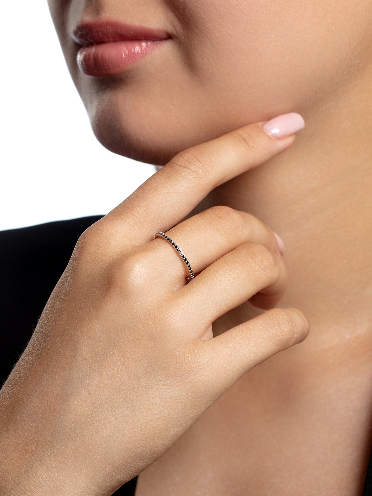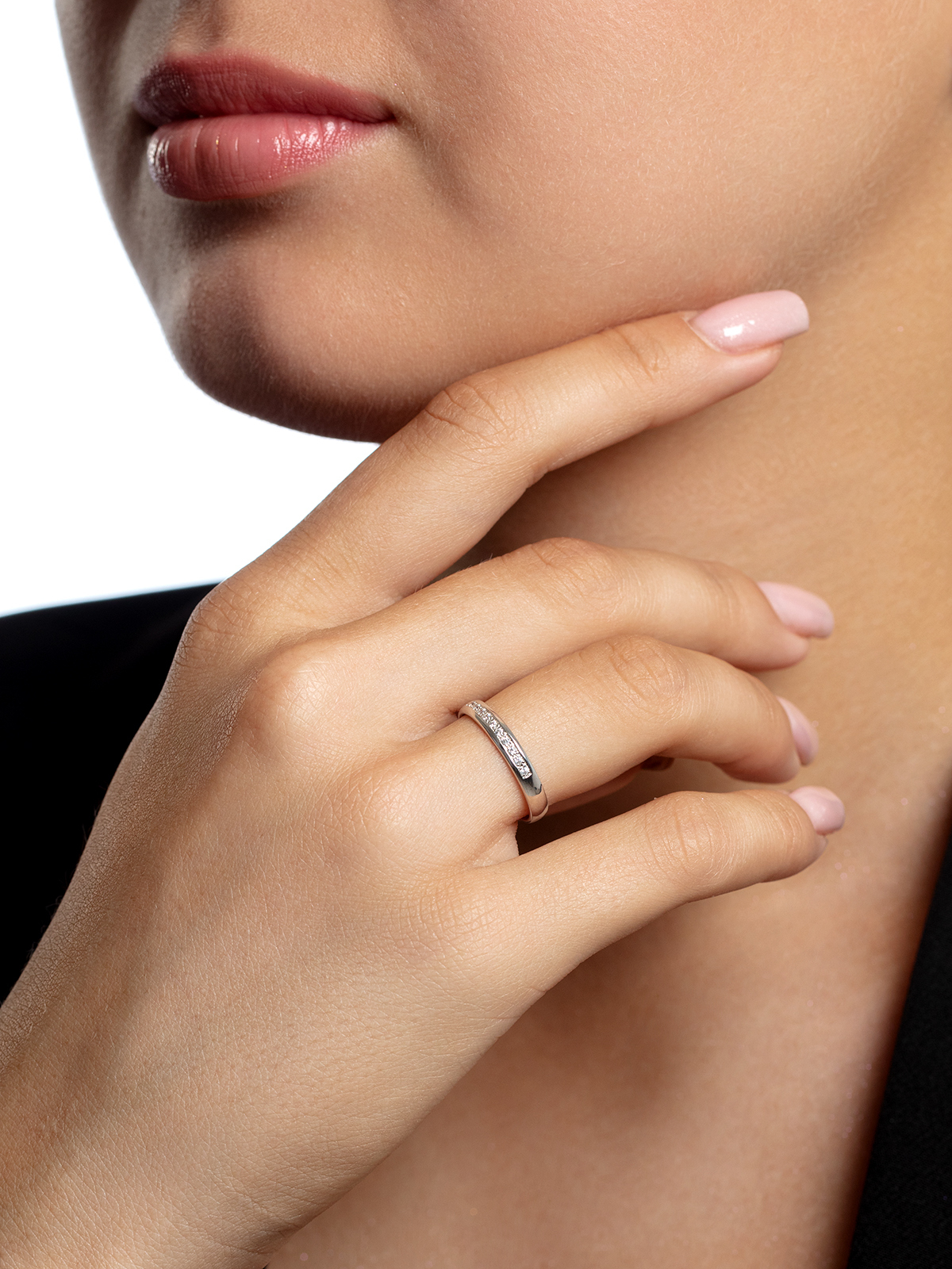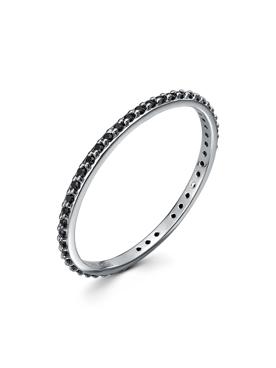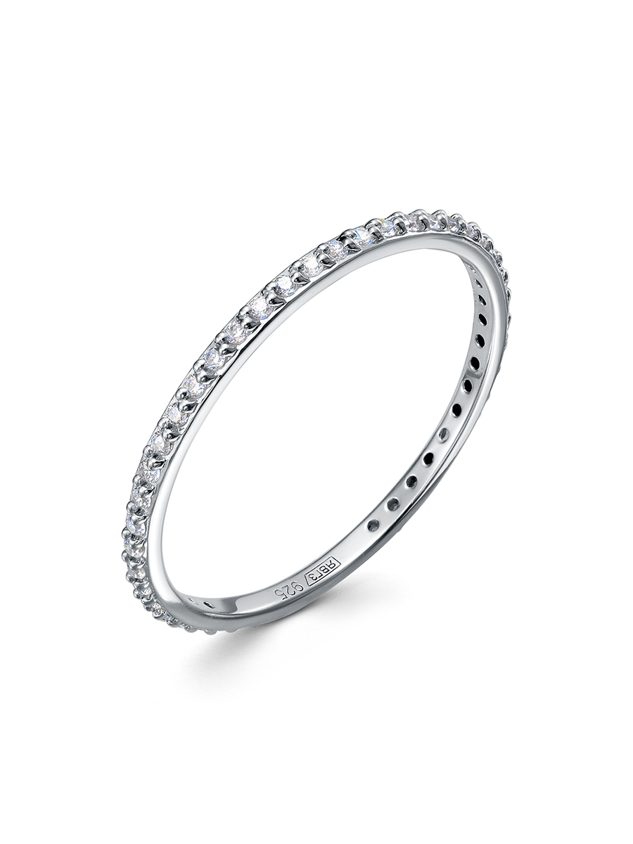 Тонкое и лёгкое кольцо из серебра 925 пробы, украшенное фианитами Swarovski. Покрытие родием обеспечивает долговечность. Вес — 0,9 г.